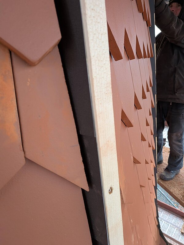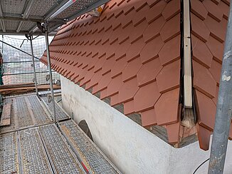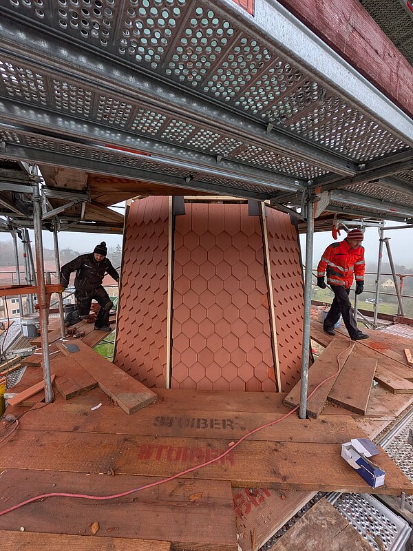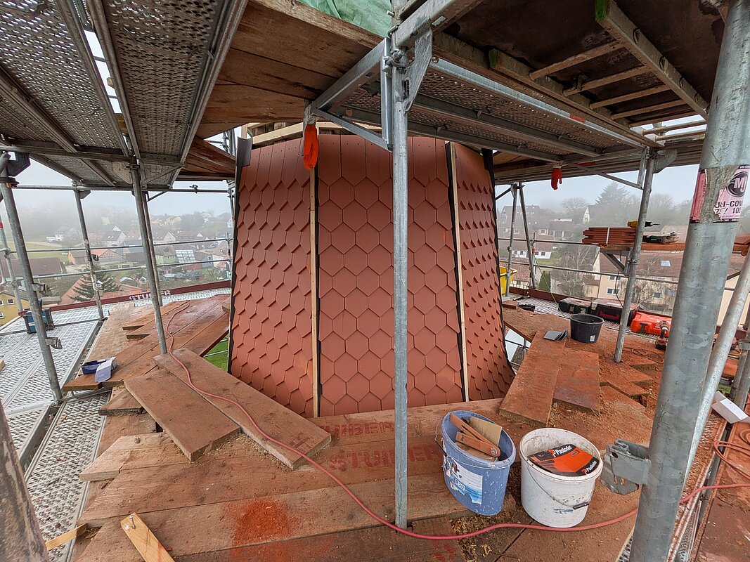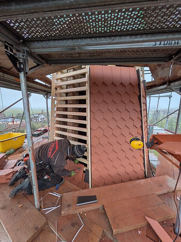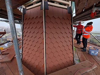 Kurz vor Weihnachten präsentiert sich der Kirchturm nun neu gedeckt. Die alten Ziegel aus dem Jahr 1968 wurden komplett durch neue ersetzt. Die steile und enge Gestalt des Dachstuhls hatte zur Folge, dass die Dachdecker viel einzuschneiden hatten. Das hat enorm Zeit in Anspruch genommen, aber das Ergebnis kann sich sehen lasen. Die Arbeiten am Turm müssen nun bis zum Frühjahr pausieren, denn die Grate können erst bei frostfreiem Wetter aufgemörtelt werden. Und dann kann zu guter letzt auch die Turmbekrönung wieder aufgesetzt werden.