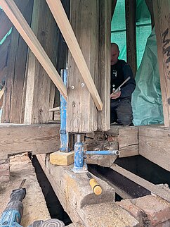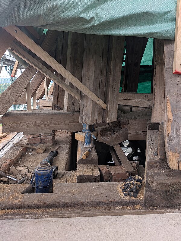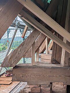 Wo Teile ausgetauscht werden, muss natürlich die Statik des Dachstuhls weiter gewährleistet bleiben. Und so stehen in diesen Tagen einige Teile des Dachstuhls "auf Stelzen", bis die neuen Teile eingebaut sind.