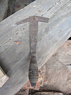 Bauen im Bestand bringt ab und zu auch nette Überraschungen - wie etwa ein Zimmermannshammer, der vermutlich 1968 im turm zurückgelassen wurde.